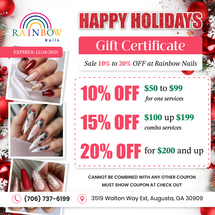 Rainbow Nails – one of the best Nail salons located conveniently in Augusta, GA 30909. We guarantee your satisfaction by the passion and many years’ experience of our technicians.