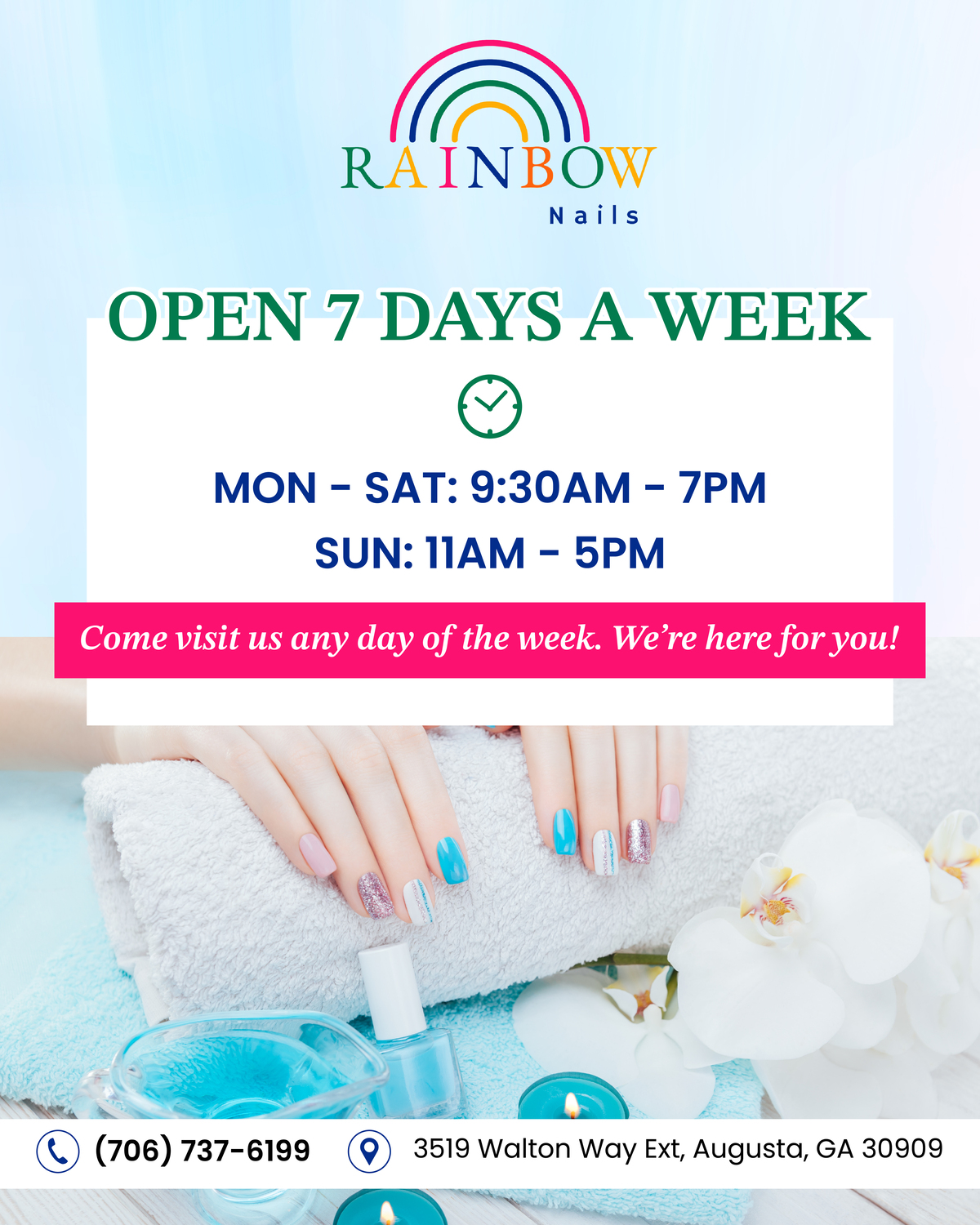 Rainbow Nails – one of the best Nail salons located conveniently in Augusta, GA 30909. We guarantee your satisfaction by the passion and many years’ experience of our technicians.